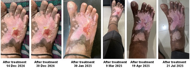 - 5 June 2025: Complete resolution of all symptoms; resumed walking with normal shoes, earlier he had to wear slippers; patient overjoyed and could hardly believe the remarkable transformation; dosage reduced to TDS.