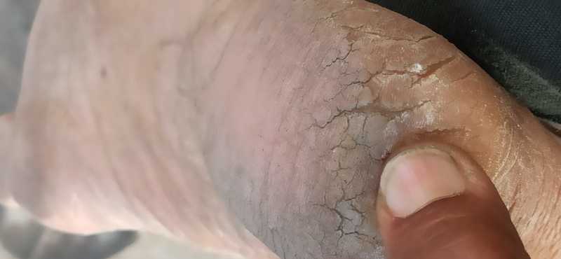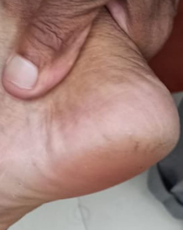 A 56-year-old watchman of the practitioner’s residential complex developed painful cracks on both his heels (severe on right heel, see pic) one year ago in June 2024. His work required prolonged standing. The cracks worsened during summer and often bled causing discomfort while standing or walking. He has been only applying mustard oil to prevent further dryness, and took no other treatment.