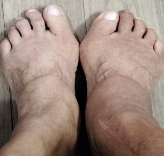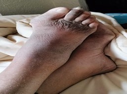 A 98-year-old man had been in excellent physical and mental health, fully independent and able to walk without a stick. Towards the end of 2024, he developed swelling and constant pain in both feet, more severe on the right side, along with generalized body pain. The pain did not subside even with rest and progressively worsened, rendering him unable to walk and confining him to his home. Over time, the skin of both feet turned brownish-black. His physical activity had stopped, appetite reduced due to stress, and his sleep was disturbed by frequent urination at night. Until the onset of these symptoms, he had led an active life, taking daily evening walks. The sudden deterioration caused considerable worry to him and his wife. He had coronary artery bypass graft surgery in 2003, but remained stable and active.